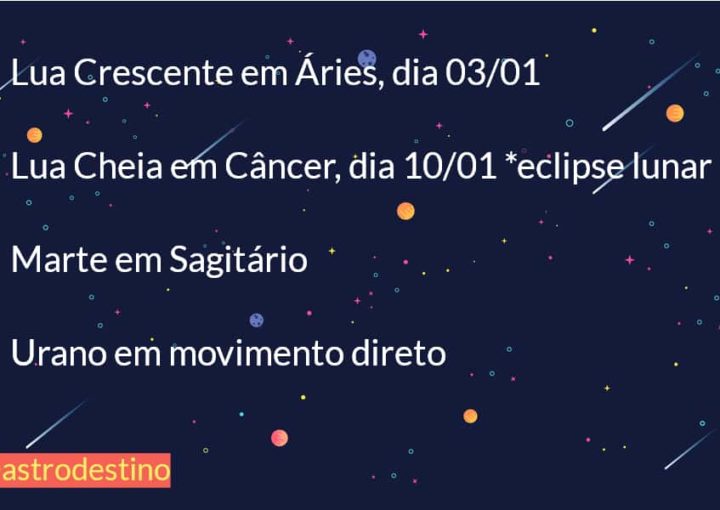 Lua Crescente em Áries no dia 3 de janeiro; Lua Cheia em Câncer no dia 10 de janeiro. Marte em Sagitário e Urano em movimento direto. Eclipse lunar em 10 de janeiro.