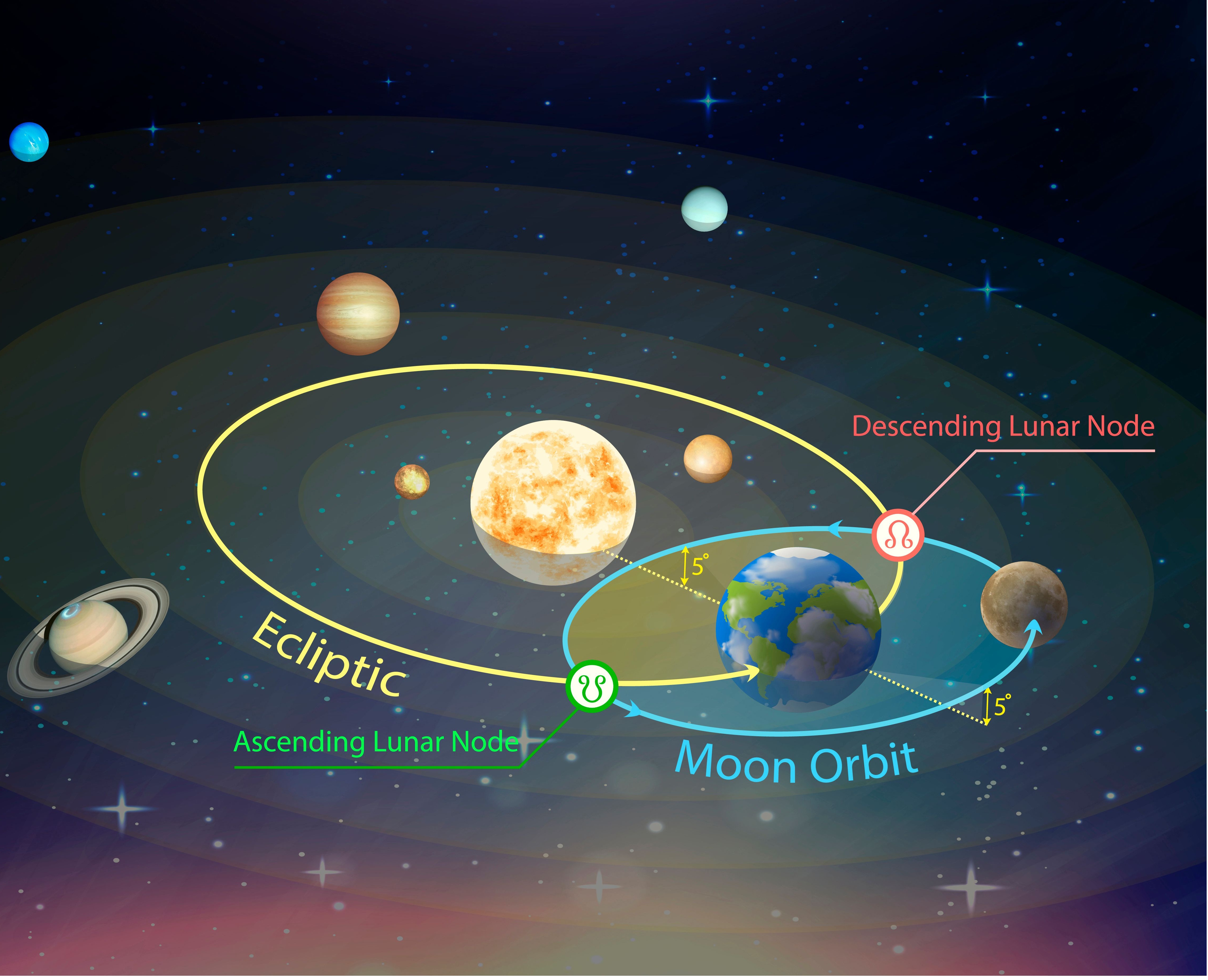 Os Nodos Lunares são dois pontos de intersecção entre a órbita da Lua ao redor da Terra e a órbita da Terra ao redor do Sol. Na interpretação astrológica, podemos eleger a leitura dos Nodos Lunares por signo e por casa, assim como a “cruz do mapa astral” como fatores fundamentais para que a leitura seja correta e coerente com o que cada um de nós veio viver.